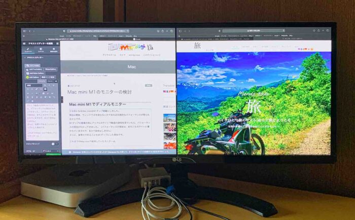 これまではモニターLG 29UM68ひとつで十分だったのですが、M1 Mac miniでは、多くの処理を同時にストレス(待ち時間無く)なく、こなせるために、もっと広い画面が欲しくなった、というのが本音です。