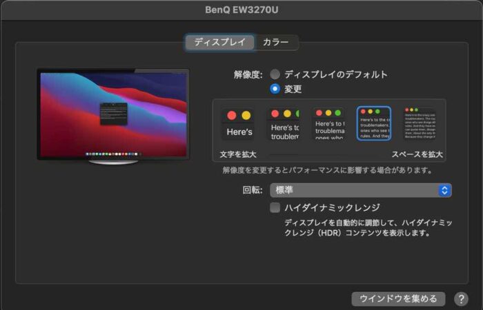 一応、Mac mini M1をUSB-Cで接続したBenQ EW3270U本体のディスプレイ設定は、さまざまな設定は可能だが、面倒な人は