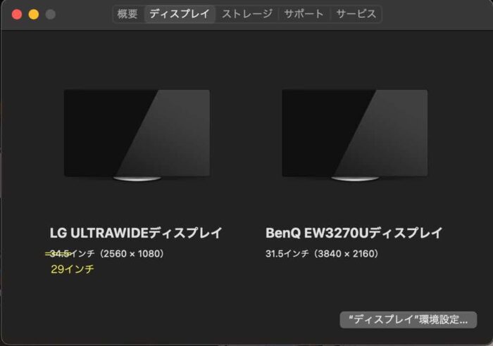 LGのモニターが何故か34.5インチと表示されましたが、29インチです。