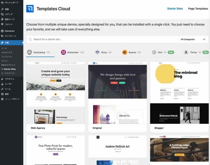 テンプレートにはエディターによって異なるみたいなので、今回はElementorサイトを構築する予定なので、Elementorを選択する。
