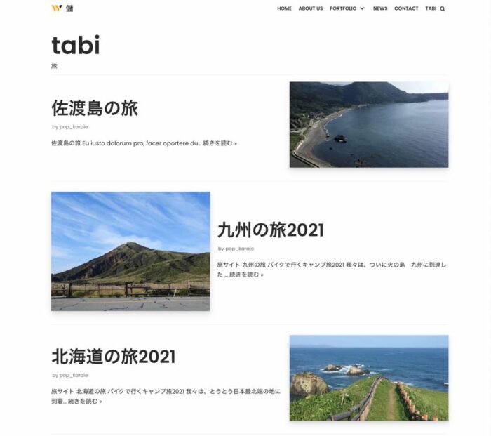 Home がフロントページになっているので、サイトを開くとこの固定ページの内容が見れます。