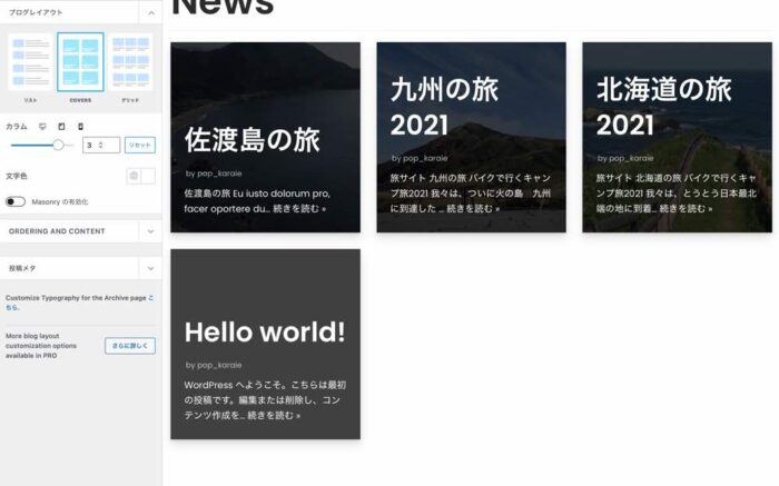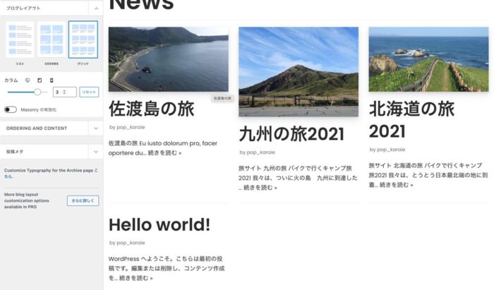 標準では上のようなブログ/アーカイブページが表示されました。