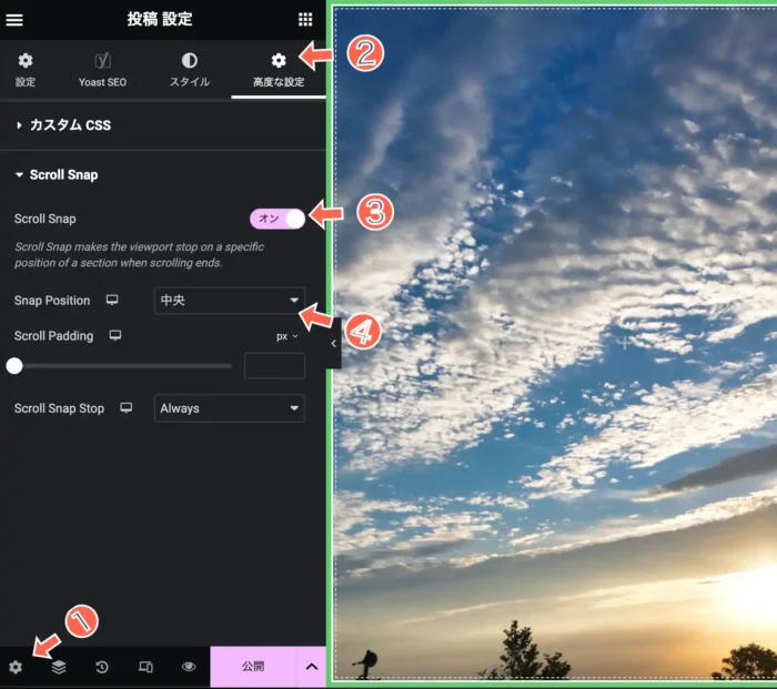 スクロール時にセクション(コンテナも含む)を所定の位置にスナップするにはどうすればよいですか?