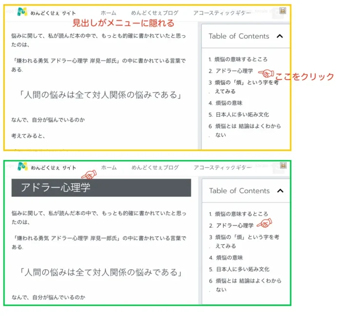 緑のように、Table of Contents のボックス内の見出しをクリックしたら、本文の見出しはメニューのすぐ下に来てほしいですね.