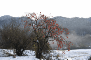 山に行く途中の柿木が目にとまった。鮮やかな色が無い冬の景色の中で柿の実の鮮やかなオレンジは目を楽しませてくれる。空が曇っていたが、もし、晴れていたならばもっと綺麗な写真が撮れたように思う。(石川県加賀市山中温泉菅生谷町周辺)
