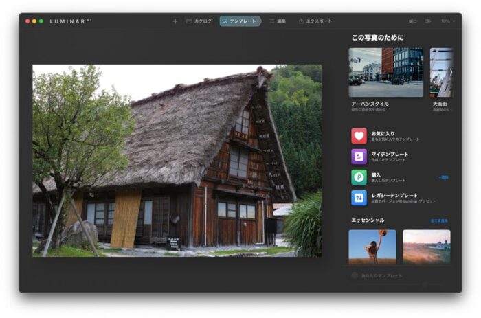 写真をLuminar AIで開いて、右上に見える「テンプレート」をクリックすると「この写真のために」というテンプレートのコレクションが見えるようになりま