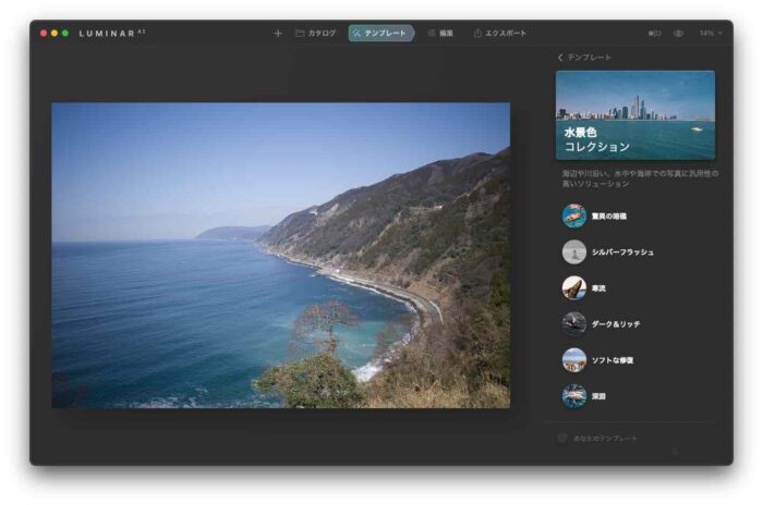 写真をLuminar AIで開いて、右上に見える「テンプレート」をクリックすると「この写真のために」というテンプレートのコレクションが見えるようになります。