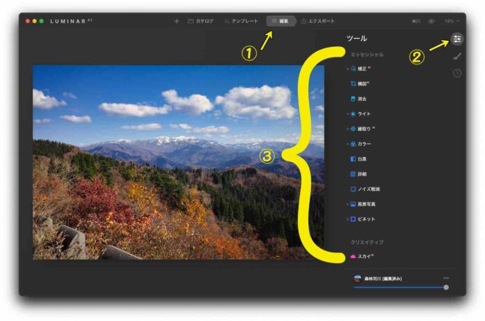 Luminar4でも使われている画像調整ツールが出てくるので、細かな変更も可能です。