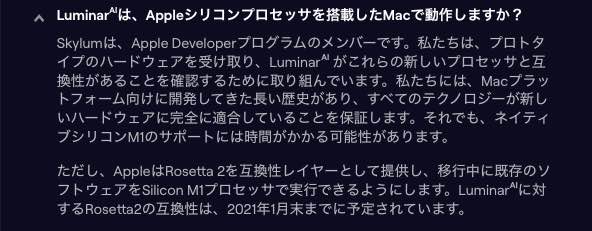 macOS用のLuminar AIの画像編集ソフトウエアはIntelチップ用でApple製M1チップのMACでは、エミュレーター(Rosetta2)で動作しているようです。
